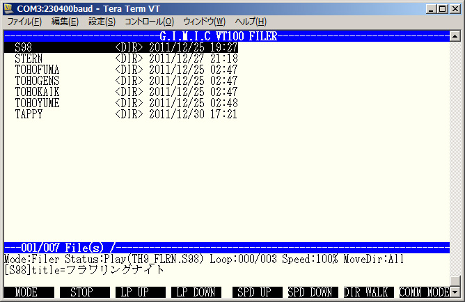 ⑥SDカードに入っている曲データが以下のようにTeraTermに表示されます。