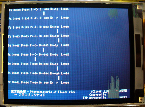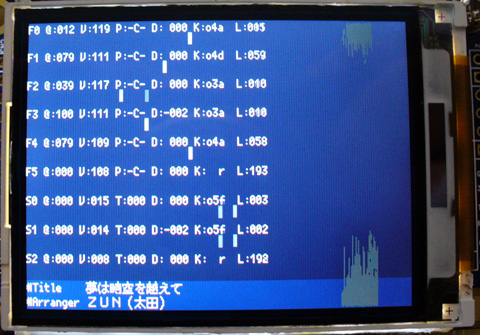 PMD再生時は曲のタイトルと編曲者及び鍵盤表示が行われます。