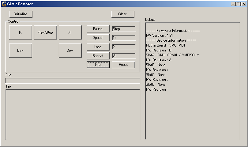 起動すると下記GUIが表示されるので、Initialize ボタンを押してGIMICを認識させます。