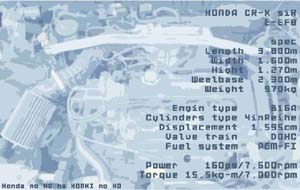初代CR−Xです。 手元に来た時点でのエンジンルーム。 この時は、インテRのエアクリが入ってました。 あ、あとバッテリーが後ろにありましたね。 この後、色々と変貌を遂げていました。 画像をいじっている内になんだかいー感じに なったので、何となく作成。 割と気に入ってます。 |