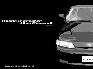 元は壁紙です(汗 気に入ってる構図なので、ついつい流用。 ホントに黒メインですね。 根暗っぷりが露呈しています。 ロゴの意味は 「ホンダはフェラーリよりエライんだ!」 一発でわかった方もいるかと思われますが 漫画の「オーバーレブ」で、EG6を操る アイカさんが放った一言。 そーだそーだ、ホンダはエライんだっ!! |