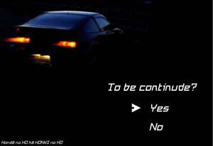 某駐車場にて撮影。 ホントはバックは夕日だった。 フツーのディスプレイで編集した後、液晶の 画面でチェックしたら、すごくアラが!! あぁ…液晶のディスプレイ欲しい… (そんなコトでかい!! To be continude?はゲームから。 事故った直後に作ったもので、最初は→が Noの方にありました。 |