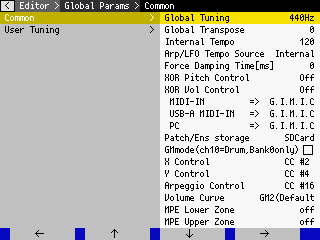 全てのMIDIチャンネルに関する設定項目について説明します。設定画面に入るには、[EDITOR]>[Global]以下の項目を選びます。本体に装着されているモジュール種別に応じて、利用可能な項目が表示されます。変更した設定値は、SDカードまたはマザーボードの内蔵メモリに記録され、起動時にロードされます。