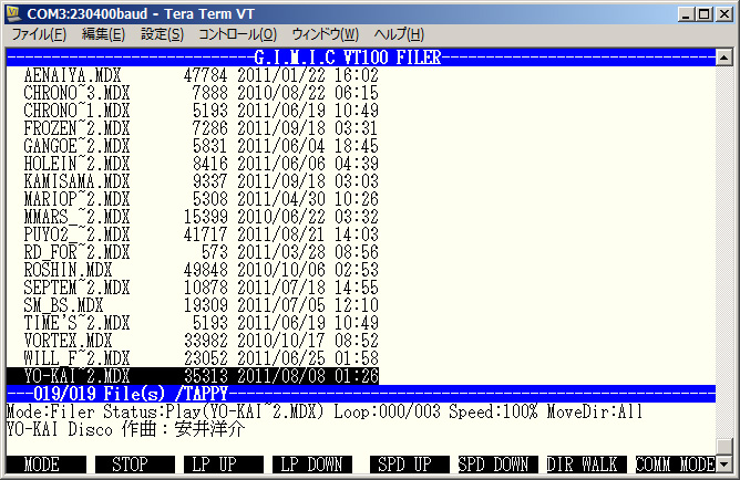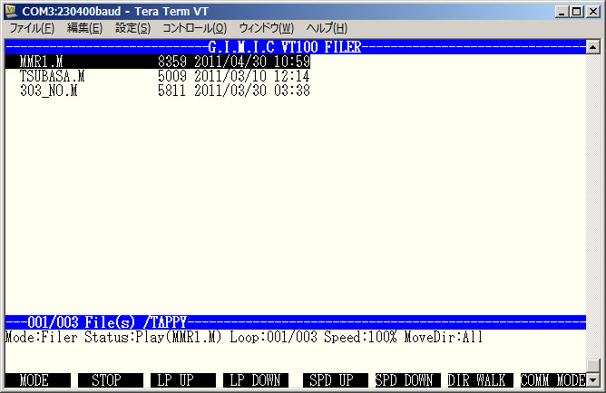 ⑥SDカードに入っている曲データが以下のようにTeraTermに表示されます。