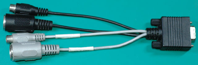 A breakout cable with 2 RCA line outs and 1 set of MIDI IO.
