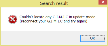 If the message below appears to alert that G.I.M.I.C couldn't be located, double-check that G.I.M.I.C is connected with a proper USB cable (not charge-only) and set to firmware update mode, then try again.